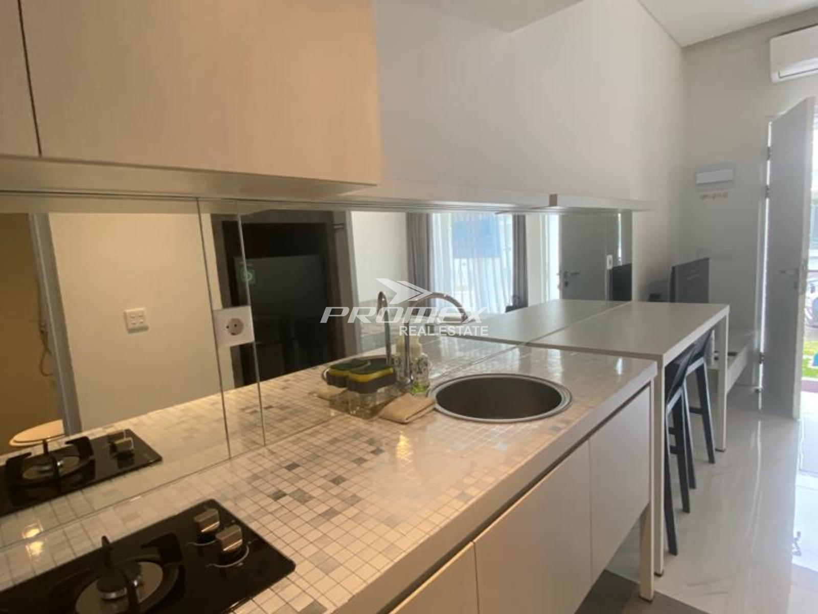 Fully furnished: Sofa, coffee table, dining table, meja kerja, rak, 3 tempat tidur, kompor, AC, gordyn.